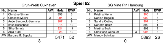 Mit 5471 Holz zeigten die Cuxhavenerinnen in Lüneburg nicht nur die Bestleistung und besiegten Gegner Nine Pin Hamburg (5393) klar, sie schlossen nach Einzelwertungspunkten mit Tabellenführer FE27 / Hansa Berlin gleich. Die erwehrten sich aber schlussendlich den Angriffen der Damen aus Rendsburg, die bis auf wenige Hölzer den Gewinn des dritten Spielpunktes verpassten, um den Grün-Weißen zum erneuten DM-Titel zu verhelfen.