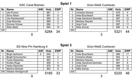 Gegen Bremen auf Bremerhavener Bahnen, das sollte für die Cuxhavenerinnen gleich ein richtiger Prüfstein werden. Christine Sinram (879), Imke Buschbeck (883), Antje Sandrock-Semmler (897), Barbara Sepcke (875), Anja Fürst (897) und Silke Schulz (890) hatten dann aber in allen Startketten die besseren Antworten auf die Bremerinnen, die mit U.Fromm (867), S.Albert (881), U.Wachtendorf (890), A.Reinicke (868), S.Grziwa (884) und S.Steitz (894) das Nachsehen hatten.