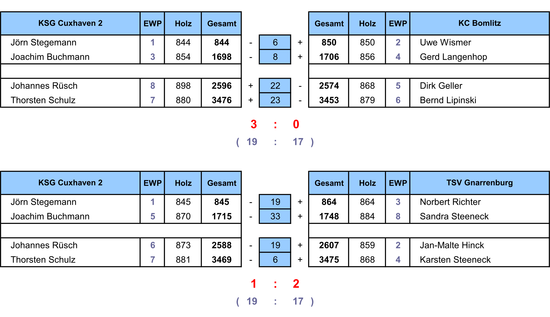 Wie schon so oft mussten die Cuxhavener gegen beide Gegner einem anfänglichen Rückstand hinterherlaufen, was gegen Bomlitz auch dank eines Spitzenergebnisses von Johannes Rüsch gut gelang. Gnarrenburg war allerdings schon zu weit enteilt, so dass die KSGer sich hier mit dem dritten Spielpunkt zufrieden geben mussten. In Lüneburg kamen zum Einsatz: Jörn Stegemann (844+845), Joachim Buchmann (854+870), Johannes Rüsch (898+873) sowie Thorsten Schulz (880+881).