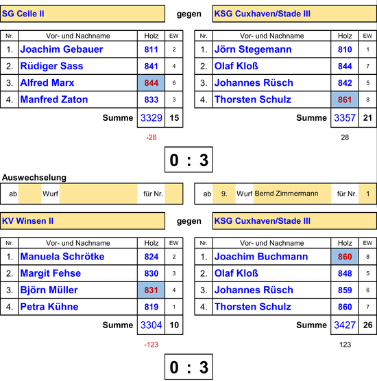 Auf den sehr speziellen Bahnen im Stader Alpa-Bowl war es für viele Akteure nicht einfach, überhaupt ein Ergebnis über Schnitt, also bei 120 Wurf 840 Holz, zu erreichen. Den KSGern gelang dieses überwiegend und so konnten sie nach einer zunächst ausgeglichenen Partie gegen Celle, die letztendlich wieder einmal Thorsten Schulz zugunsten seines Teams entschied, einen Kantersieg über Winsen verbuchen. Hier beeindruckte vor allem die gute Mannschaftsleistung, die diesem Team dann auch verdient Rang zwei in der Bezirksliga einbrachte. Zum Einsatz kamen Jörn Stegemann (810), Olaf Kloß (844+848), Joachim Buchmann (860), Johannes Rüsch (842+859) sowie Thorsten Schulz (861+860).