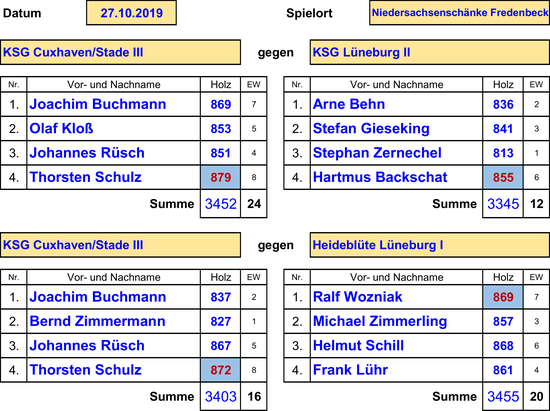 Hohe Ergebnisse waren auf den Fredenbecker Bahnen nicht zu erwarten. Im ersten Spiel profitierten die KSGer noch von zwei Ergebnissen der Lüneburger unter Schnitt, im zweiten Spiel wurden genau zwei solcher Resultate ihnen selbst zum Verhängnis. Spielbester war Thorsten Schulz mit 879 und 872 Holz. Weiter kegelten Joachim Buchmann (869+837), Olaf Kloß (853), Johannes Rüsch (851+867) sowie Bernd Zimmermann (827).