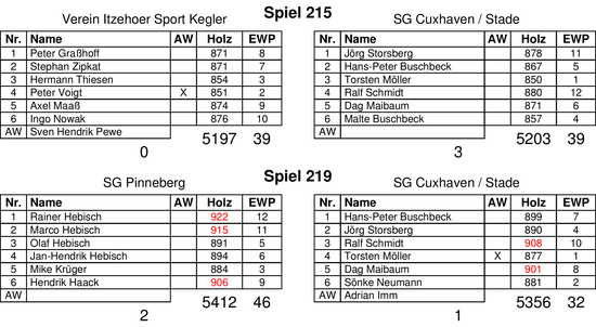 Auf den nicht einfach zu spielenden Bahnen in Itzehoe hatten die KSGer am Sonnabend nach zwei Startketten die Nase vorn und stellten dabei mit Ralf Schmidt und Jörg Storsberg die beiden spielbesten Akteure, der Vorsprung schmolz in einer spannenden Partie letztendlich aber doch noch bis auf drei Holz zusammen.Das Sonntagsspiel in Pinneberg beim Tabellenzweiten war trotz guter Ansätze der Gäste dann nicht zu gewinnen. Der dritte Spielpunkt ging dann aber verdient an den Staffelmeister KSG Cuxhaven / Stade, die mit Hans-Peter Buschbeck (867+899), Jörg Storsberg (878+890), Torsten Möller (850), Torsten Möller / Adrian Imm (877), Ralf Schmidt (880+908), Dag Maibaum (871+901), Malte Buschbeck (857) und Sönke Neumann (881) im Einsatz waren.