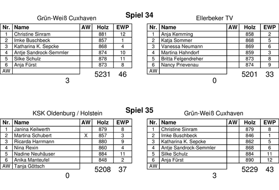 Ein optimaler Auftakt gelang den Cuxhavenerinnen am Sonntag in Delmenhorst gegen die Ellerbekerinnen, die den Grün-Weißen in allen Startketten unterlegen waren. Dabei waren bei den schwierigen Bahnen keine großen Holzunterschiede zu erwarten und so manche Spielerin der hier kegelnden vier Teams hatte zu kämpfen, überhaupt ein positives Ergebnis zu erzielen. Christine Sinram (881) und Imke Buschbeck (857) eröffneten gegen A.Kemming (858) und K.Sommer (868) und holten +12 Holz. Um +14 Holz erhöhten dann Katharina Sepcke (868) und Antje Sandrock-Semmler (874) gegen V.Neumann (869) und M.Hahndorf (859), bevor Silke Schulz (878) und Anja Fürst (873) in einem spannenden Finale die drei Punkte gegen B.Felgendreher (873) und N.Prievenau (874) absicherten.