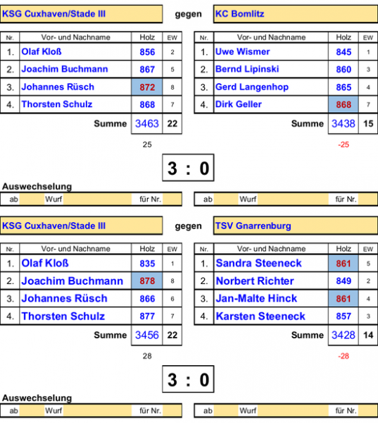 Gegen die zwei Mannschaften die in der Tabelle vor ihnen postiert waren zeigten die KSGer überwiegend gute Leistungen und konnten trotz eines Fehlstarts in der zweiten Partie ihren zweiten Doppelsieg der Saison feiern. Zum Einsatz kamen hier Olaf Kloß (856+835), Joachim Buchmann (867+878), Johannes Rüsch (872+866) sowie Thorsten Schulz (868+877).