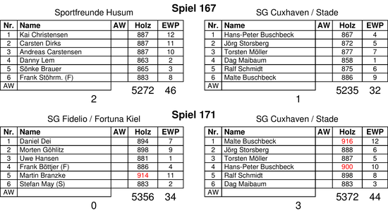 So wurde es nichts mit dem erhofften Auftaktsieg und das Team hatte sich für Sonntag in der Fördestadt Wiedergutmachung vorgenommen. Malte Buschbeck setzte mit 916 Holz gleich die Bestmarke der Begegnung und mit Jörg Storsberg (888) holte er gegen D.Dei (894) und M.Göhlitz (898) einen knappen Vorsprung heraus. Torsten Möller (887) und Hans-Peter Buschbeck (900) erhöhten diesen gegen U.Hansen (881) und F.Böttjer (886), womit ein Auswärtsdreier zum Greifen nahe war. Das war für die Stader Ralf Schmidt (898) und Dag Maibaum (883) gegen M.Branzke (914) und S.May (883) allerdings kein Selbstläufer, doch diese nervenstarke KSG-Schlussachse setzte sich durch und sicherte dem Team den ersten Auswärtssieg.