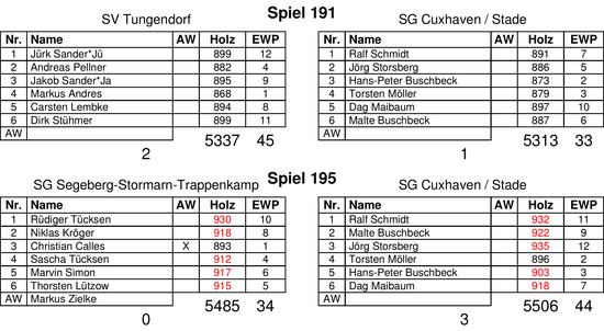 Es ist wie verhext, die bis dahin beste Leistung einer Gastmannschaft reichte am Sonnabend in Tungendorf wie im Vorjahr nicht zum Sieg. Erneut waren die Hausherren gegen die KSGer besonders motiviert und waren nach einer umkämpften Partie froh, nur den dritten Spielpunkt abgeben zu müssen. Den verdienten sich Ralf Schmidt (891) und Jörg Storsberg (886) gegen Jü.Sander (899) und A.Pellner (882) ebenso wie Hans-Peter Buschbeck (873) und Torsten Möller (879) gegen Ja.Sander (895) und M.Andres (868). Dag Maibaum (897) und Malte Buschbeck (887) konnten dem Spiel trotz guter Leistungen gegen die starken Tungendorfer C.Lembke (894) und D.Stühmer (899) keine Wendung mehr geben.