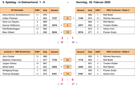 Auf den schwierigen Bahnen in Delmenhorst taten sich wie immer viele Akteure schwer, ein gutes Ergebnis zu erzielen, wobei auf einigen Ansätzen kaum Plushölzer gelangen. Ralf Boldt (869) und Sönke Neumann (874) machten den Auftakt und brachten die KSG leicht in Front. Nach Rolf Meiritz (864) und Torsten Walter (864) drehte sich dann aber das Spiel und Adrian Imm (872) und Florian Graitz (871) mussten dann auch noch Federn lassen, konnten mit ihren Leistungen den Deinstedtern allerdings den dritten Spielpunkt streitig machen.