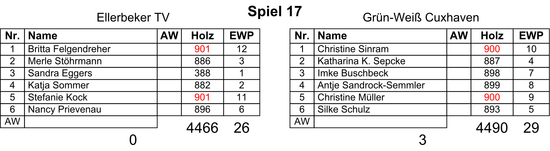 Die Cuxhavenerinnen starteten in Glinde gegen den Ellerbeker TV und kehrte mit einem Sieg nach Hause. Holzgleich war der Stand nach der Startachse mit Christine Sinram 900 (901) und Katharina Sepcke 887 (886), nach der Mittelachse mit Imke Buschbeck 898 (388) und Antje Sandrock-Semmler 899 (882) ging Grün-Weiß in Führung und die Schlussachse mit Christine Müller 900 (901) und Silke Schulz 893 (896) machte den ersten Sieg und die tolle Mannschaftsleistung komplett. Es fehlten Anja Fürst und Barbara Sepcke.