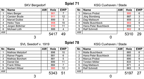 Die Startachse mit Malte Buschbeck (885) und Hans-Peter Buschbeck (855) sollte eigentlich die Weichen auf den Gewinn des Zusatzpunktes stellen, doch durch viele Fehlhölzer zogen Mathias Metzdorf (898) und Rainer Pagels (881) deutlich vorbei. Die Mittelachse mit Torsten Möller (833) und Marcus Probst (890) sollte jetzt aufholen, doch das klappte nicht. Zu stark spielten Daniel Dei (899) und Mathias Borchert (881). Die Schlussachse mit Dag Maibaum (871) und Ralf Schmidt (863) hätte jetzt jeweils 885 Holz spielen müssen, um den Zusatzpunkt zu holen, doch davon waren sie weit entfernt. Währenddessen zogen Frank Wilke (884) und Norbert Witzel (900) deutlich vorbei und machten den Sack zu. Bis auf Marcus Probst und Malte Buschbeck konnte sich an diesem Tag niemand so richtig auf diese schwierigen Bahnverhältnisse einstellen und so konnte man nur der glücklichen Heimmannschaft zu einem klaren 3:0-Erfolg gratulieren.