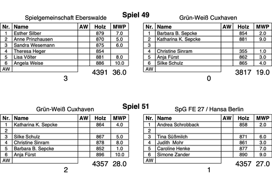 Im zweiten Spiel des Tages gegen SpG FE27 / Hansa Berlin erkämpfte sich das Team ein äußerst seltenes Unentschieden, das am Ende durch die beste Einzelleistung von der Cuxhavenerin Anja Fürst mit 2:1 für Grün-Weiß gewertet wurde. Beide Mannschaften stehen jetzt punktgleich auf den Plätzen zwei und drei der Bundesligatabelle.
