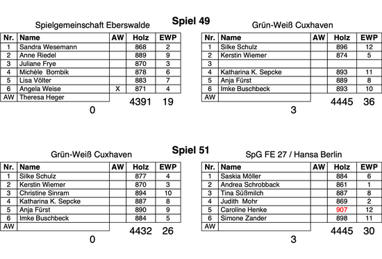 Damit hatte die Cuxhavener Schlussachse einen Vorsprung von 18 Holz. Aber die Berlinerinnen hatten ja noch die Einzelwertungsführende Caroline Henke. Diese stellte mit 907 Holz die Spielbestmarke gegen 890 Holz von Anja Fürst auf. Ebenso großartig traf Simone Zander mit 898 Holz gegen Imke Buschbeck mit 884 Holz. Durch diese Leistungen der Berlinerinnen in der Schlussachse wurde die Partie noch gedreht.