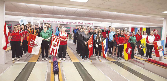 (Bild) Feierlicher Moment bei den 95. Deutschen Meisterschaften im Kegeln. Die Nationalhymne wird nach dem Einmarsch der teilnehmenden Mannschaften aus den verschiedenen Bundesländern abgespielt.