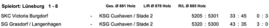 In der Verbandsliga der Herren im Sportkegeln gab es für die KSG Cuxhaven / Stade II einen Sieg und eine Niederlage. (1) Das erste Spiel in Lüneburg war eine klare Sache für die KSG. Mannschaftsführer...