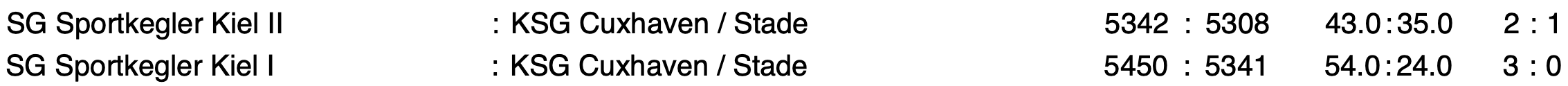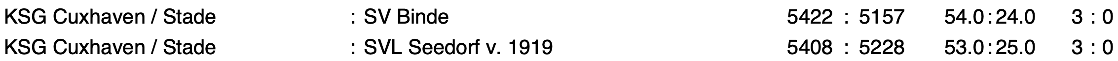Die KSG Cuxhaven / Stade beendete das Punktspiel-Wochenende mit sicheren 6:0 Punkten gegen direkte Konkurrenten. Die Bundesliga-Sportkegler gewannen im Kegelzentrum gegen den SV Binde und SVL Seedorf jeweils...