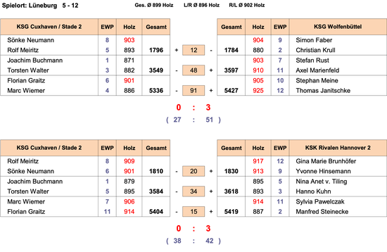 (1) Die Startachse mit Sönke Neumann (903) und Rolf Meiritz (893) brachte die KSG mit 12 Holz in Führung. Die Mittelachse mit Joachim Buchmann (871) und Torsten Walter (882) bekam die ganze Klasse des Tabellenführers zu spüren und musste 60 Holz abgeben. Die Schlussachse der KSG mit Florian Graitz (901) und Marc Wiemer (886) hatte keine Chance. So gewann die KSG Wolfenbüttel mit 91 Holz.