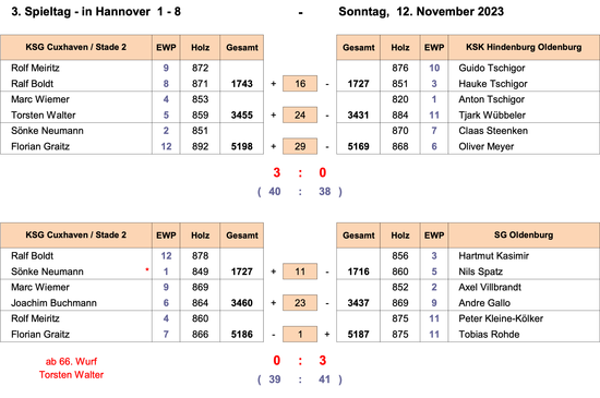 Am Ende verloren beide insgesamt 24 Holz und die Mannschaft der SG Oldenburg hatte das Spiel noch mit einem Holz Vorsprung gewonnen.
