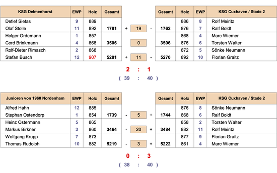 Die Schlussachse mit Sönke Neumann (872) und dem Spielbesten KSG’er Florian Graitz (892) verlor aber das Spiel noch mit 11 Holz. Ausschlaggebend war das Tageshöchstergebnis des Delmenhorsters Busch mit 907 Holz. Der Zusatzpunkt ging aber mit 40:39 an die KSG.